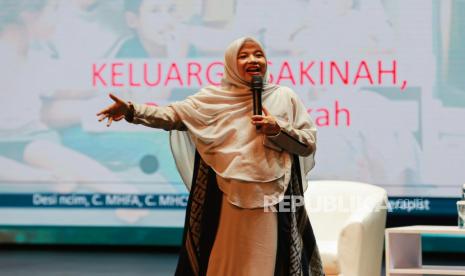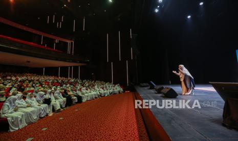 Ustadzah Desi Indrawati memberikan tausiyah saat Tabligh Akbar Republika di ISEF 2025, JIExpo, Kemayoran, Jakarta, Sabtu (11/10/2025). (FOTO : Republika/Thoudy Badai)