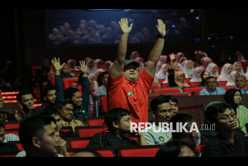 Peserta memberikan pertanyaan kepada Habib Husein Jafar saat Tabligh Akbar Republika di ISEF 2025, JIExpo, Kemayoran, Jakarta, Sabtu (11/10/2025). Republika bekerjasama dengan Bank Indonesia menggelar Tabligh Akbar pada gelaran Indonesia Sharia Economic Festival (ISEF) 2025 bertema Muda, Taqwa, Berdaya yang diharapkan dapat mengingatkan anak muda agar mampu menjadi generasi yang bermanfaat bagi kehidupan sosial berlandaskan agama. (FOTO : Republika/Thoudy Badai)