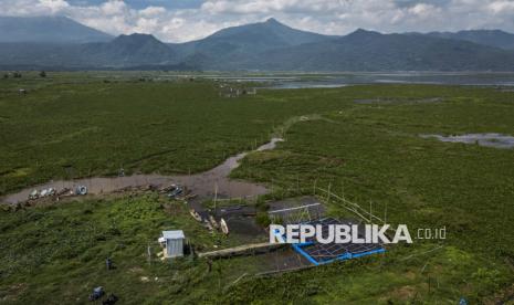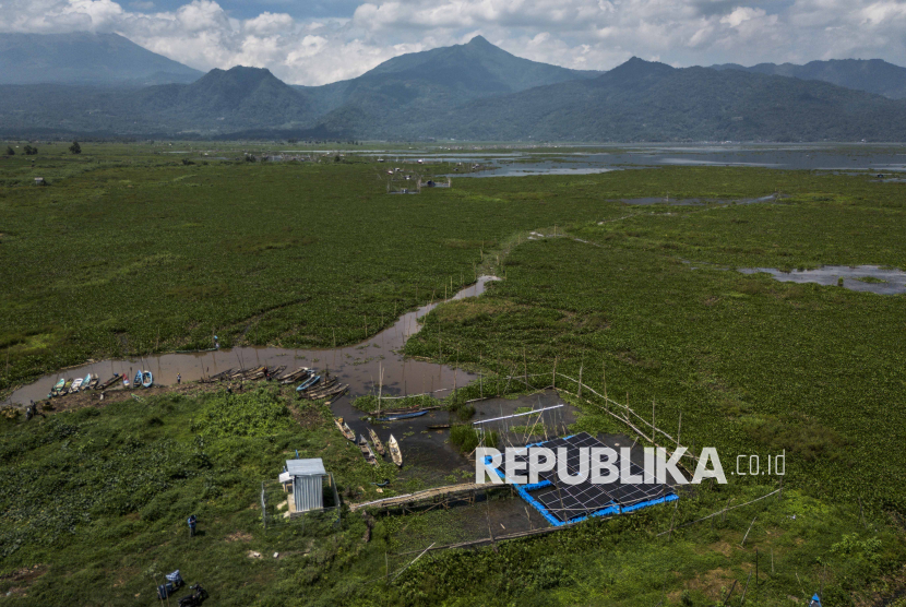 Foto udara kondisi Pembangkit Listrik Tenaga Surya (PLTS) Terapung Rawa Pening di Desa Kesongo, Tuntang, Kabupaten Semarang, Jawa Tengah, Ahad (12/10/2025). Pemerintah Desa Kesongo bersama Politeknik Negeri Semarang (Polines) melalui program Smart Farming berbasis PLTS Terapung Rawa Pening mengembangkan sistem pengairan cerdas berbasis energi surya berkapasitas 20 kWp yang memanfaatkan rangkaian Pompa Air Tenaga Surya (PATS) untuk mengairi sekitar 10 - 15 hektare lahan pertanian sehingga menjadi solusi berkelanjutan bagi petani, terutama saat musim kemarau ketika permukaan air di Danau Rawa Pening mulai surut. (FOTO : ANTARA FOTO/Aprillio Akbar)
