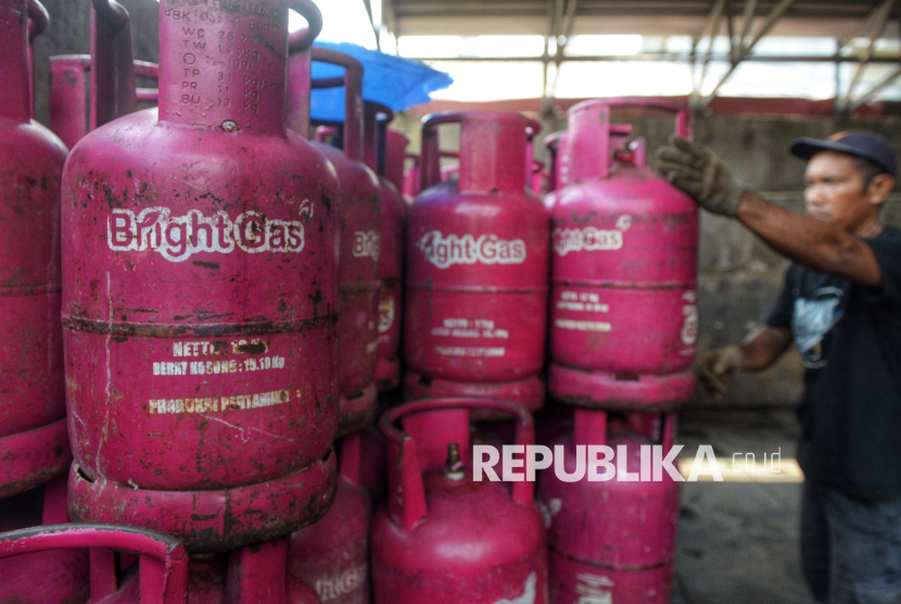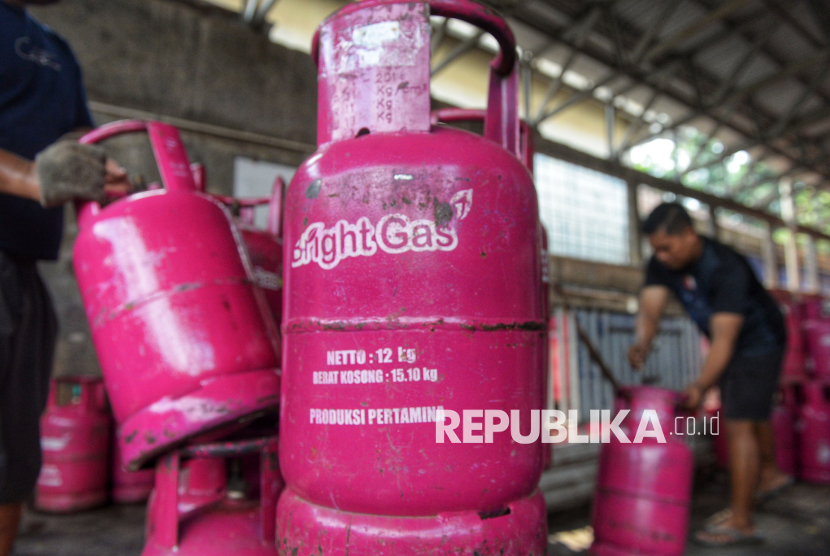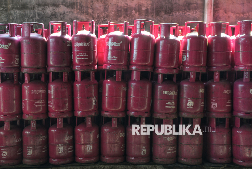 Tabung gas LPG nonsubsidi di agen di Kawasan Pasar Rebo, Jakarta, Senin (20/4/2026). Pertamina menaikkan harga Liquefied Petroleum Gas (LPG) nonsubsidi ukuran 12 kg dari Rp 192.000 per tabung menjadi Rp 228.000 per tabung atau naik 18,75 persen. Kenaikan harga LPG tersebut merupakan yang pertama sejak 2023. (FOTO : Republika/Prayogi)