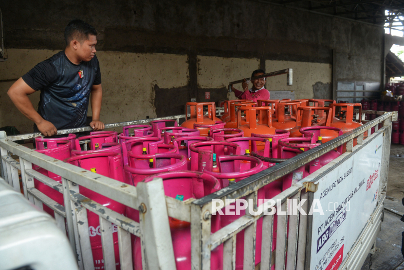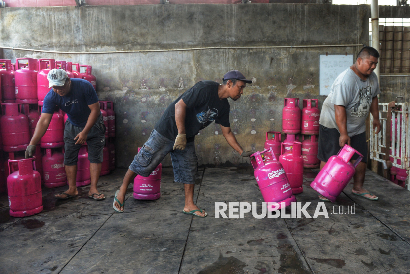 Pekerja menata tabung gas LPG nonsubsidi di agen di Kawasan Pasar Rebo, Jakarta, Senin (20/4/2026). PT Pertamina Patra Niaga menetapkan harga baru produk Liquefied Petroleum Gas (LPG) nonsubsidi untuk tabung 5,5 kg naik sebesar Rp17.000 atau menjadi Rp107.000 per tabung, dan tabung 12 kg menjadi Rp228.000 atau mengalami kenaikan Rp36.000 dari harga sebelumnya. Kenaikan harga LPG tersebut merupakan yang pertama sejak 2023. (FOTO : Republika/Prayogi)