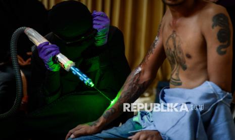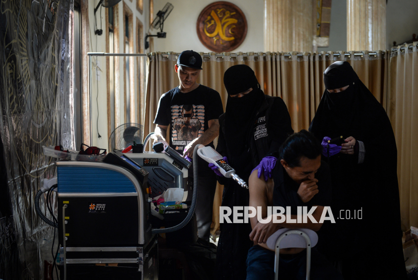 REPUBLIKA.CO.ID, TANGERANG -- Anggota Komunitas Berani Hijrah Baik menggunakan laser menghapus tato seorang pria di Masjid Jami Al Ihsaniyah, Tigaraksa, Kabupaten Tangerang, Banten, Ahad (12/10/2025).