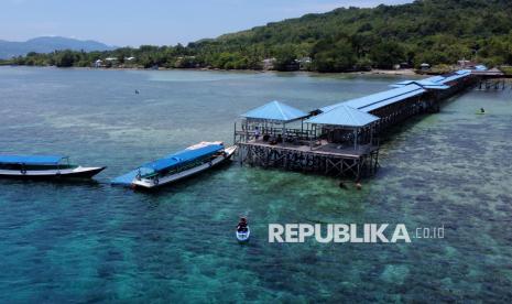 Foto udara pengunjung menggunakan paddle board di dekat dermaga Pulau Karampuang, Mamuju, Sulawesi Barat, Sabtu (11/10/2025). Pemerintah setempat mengembangkan objek wisata Pulau Karampuang yang marak dikunjungi wisatawan domestik dan mancanegara dengan meningkatkan fasilitas penunjang seperti penginapan, area camping, UMKM, penyewaan alat snorkeling, diving, jet ski, paddle, dan wahana permainan untuk mendongkrak perekonomian masyarakat di daerah itu. (FOTO : ANTARA FOTO/Akbar Tado)