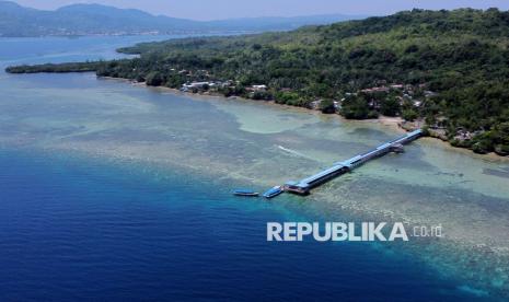 Foto udara kawasan wisata Pulau Karampuang, Mamuju, Sulawesi Barat, Sabtu (11/10/2025). Pemerintah setempat mengembangkan objek wisata Pulau Karampuang yang marak dikunjungi wisatawan domestik dan mancanegara dengan meningkatkan fasilitas penunjang seperti penginapan, area camping, UMKM, penyewaan alat snorkeling, diving, jet ski, paddle, dan wahana permainan untuk mendongkrak perekonomian masyarakat di daerah itu. (FOTO : ANTARA FOTO/Akbar Tado)