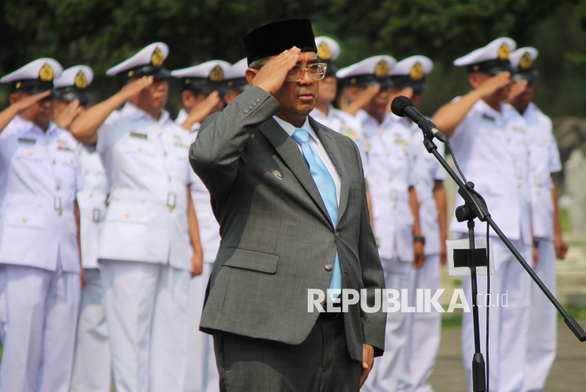 Wali Kota Bandung Muhammad Farhan melakukan penghormatan saat ziarah ke makam pahlawan Bandung Lautan Api (BLA) di Tempat Makam Pahlawan Cikutra, Kota Bandung, Kamis (23/4/2026). Ziarah menjadi simbol penghormatan atas jasa para pahlawan BLA, sekaligues merefleksikan semangat perjuangan dan meneladani jiwa patriotisme para pahlawan dalam menghadapi penjajah. (FOTO : Edi Yusuf)
