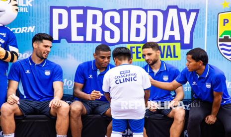Pesepak bola Persib Bandung Adam Alis (kanan), Luciano Guaycochea (kedua kanan), Uilliam Barros (kedua kiri) dan Julio Cesar (kiri) memberikan tanda tangan kepada seorang anak saat mengikuti kegiatan Persibday Festival 2025 di Stadion Gelora Bandung Lautan Api (GBLA), Bandung, Jawa Barat, Ahad (12/10/2025). Kegiatan tersebut merupakan bentuk komitmen Persib dalam merayakan kebersamaan bagi generasi muda yang mencintai sepak bola serta mempererat hubungan dengan Bobotoh (pendukung Persib Bandung) seperti bertemu langsung dengan pesepak bola, pameran piala juara hingga mengunjungi sejumlah ruangan tim di Stadion GBLA. (FOTO : ANTARA FOTO/Novrian Arbi)