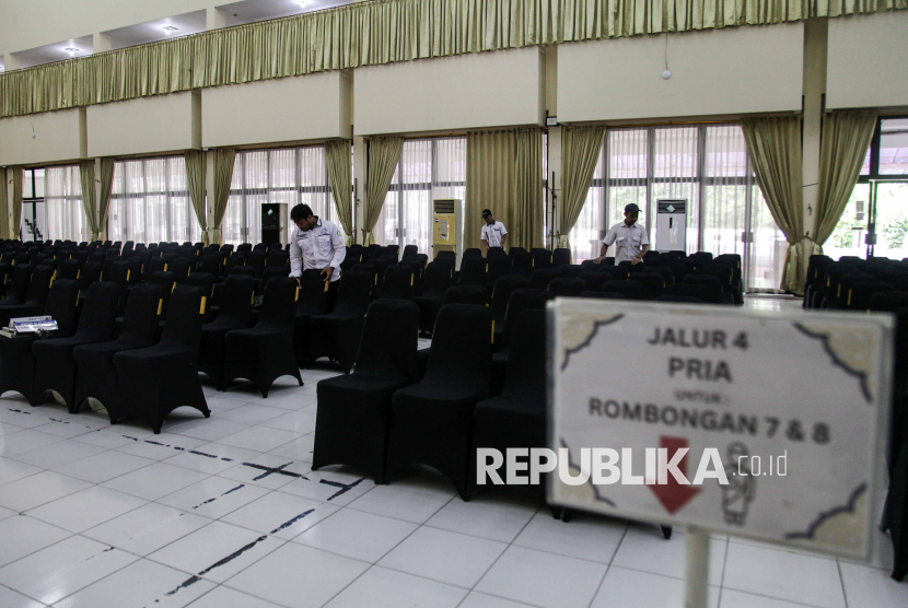 Tiga petugas menata bangku untuk jamaah calon haji di Asrama Haji Embarkasi Bekasi, Jawa Barat, Senin (20/4/2026). Asrama Haji Bekasi menampung sebanyak 29.643 jamaah calon haji dari 28 kloter di Jawa Barat sebelum diberangkatkan secara bertahap ke tanah suci mulai 22 April 2026. (FOTO : ANTARA FOTO/Darryl Ramadhan)