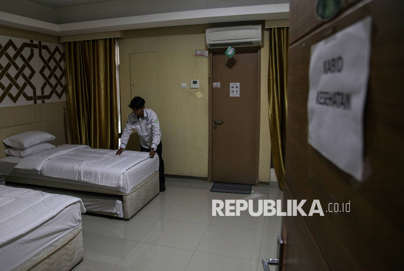 Petugas merapikan tempat tidur di Asrama Haji Embarkasi Bekasi, Jawa Barat, Senin (20/4/2026). Asrama Haji Bekasi menampung sebanyak 29.643 jamaah calon haji dari 28 kloter di Jawa Barat sebelum diberangkatkan secara bertahap ke tanah suci mulai 22 April 2026. (FOTO : ANTARA FOTO/Darryl Ramadhan)