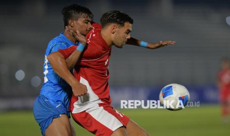 Pesepak bola Timnas Indonesia U-23 Victor Dethan berusaha melewati adangan pesepak bola Timnas India U-23 pada laga persahabatan di Stadion Madya, Kompleks GBK, Jakarta, Jumat (10/10/2025). Indonesia dikalahkan India dengan skor 1-2. (FOTO : Edwin Putranto/Republika)