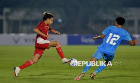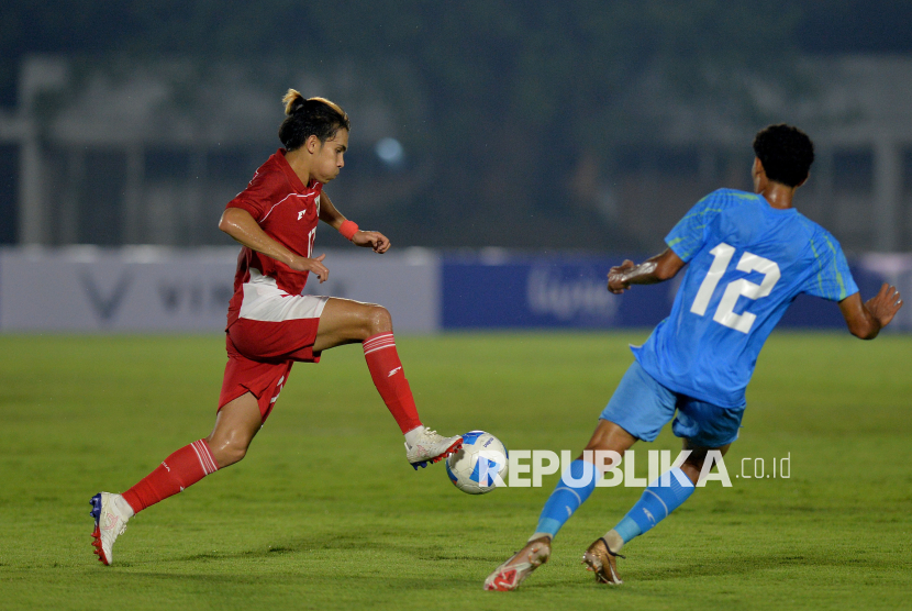 Pesepak bola Timnas Indonesia U-23 Rahmat Arjuna berusaha melewati adangan pesepak bola Timnas India U-23 pada laga persahabatan di Stadion Madya, Kompleks GBK, Jakarta, Jumat (10/10/2025). Indonesia dikalahkan India dengan skor 1-2. (FOTO : Edwin Putranto/Republika)