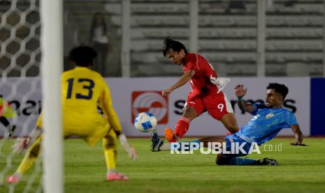 Pesepak bola Timnas Indonesia U-23 Ricky Pratama melepaskan tendangan ke gawang India pada laga persahabatan di Stadion Madya, Kompleks GBK, Jakarta, Jumat (10/10/2025). Indonesia dikalahkan India dengan skor 1-2. (FOTO : Edwin Putranto/Republika)